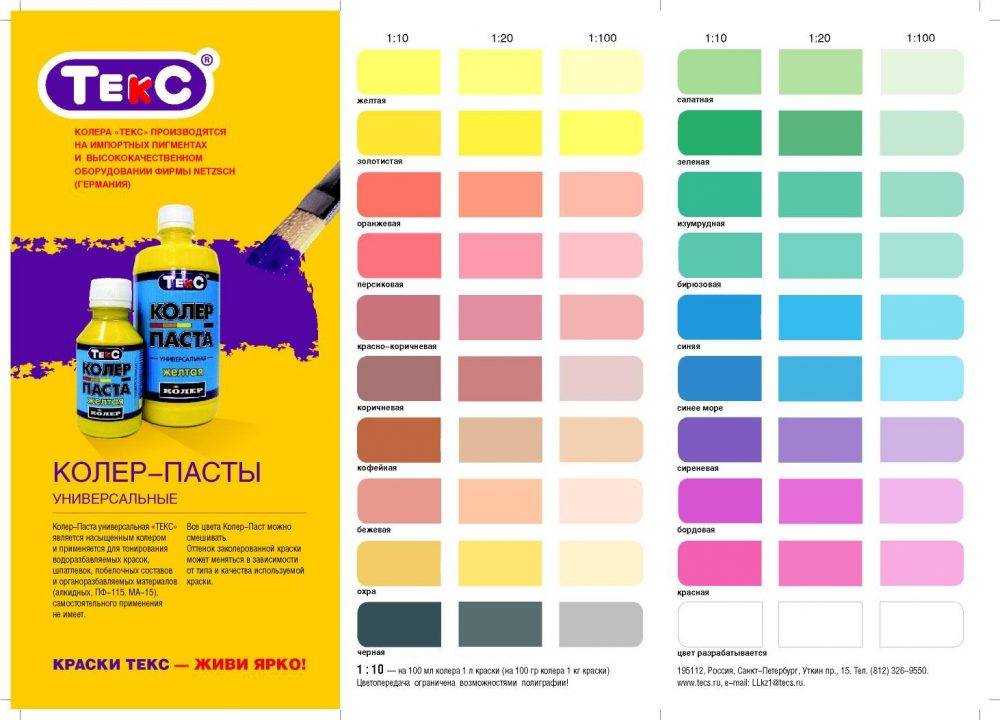 Лучше сразу же рассчитать, сколько колера потребуется на 1 кг краски для получения желаемого цвета, чтобы потом не пришлось его докупать. При подсчете следует учитывать насыщенность цвета и вид поверхности.
