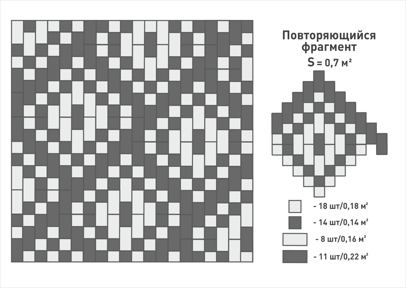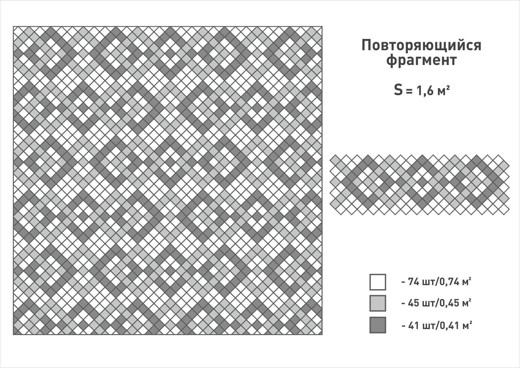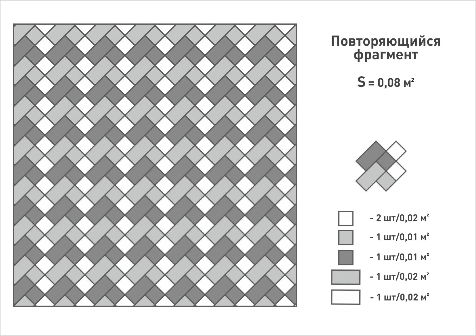 Здесь при расчете количества материала нужно на каждый м2 белых квадратиков – 0,25, серых – 0,125, темно-серых – 0,125, серой брусчатки – 0,25, темно-серой – 0,25.
