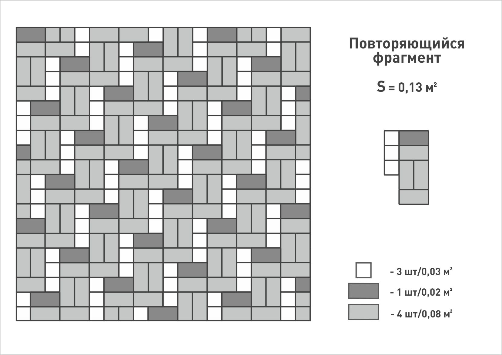 В таком рисунке на каждые 1,2 м2 мощения необходимо брусчатки – 0,4 м2 серой (33,33%) и 0,6 м2 белой (50%), маленького квадрата по 0,1 м2 каждого оттенка (по 8,33%).