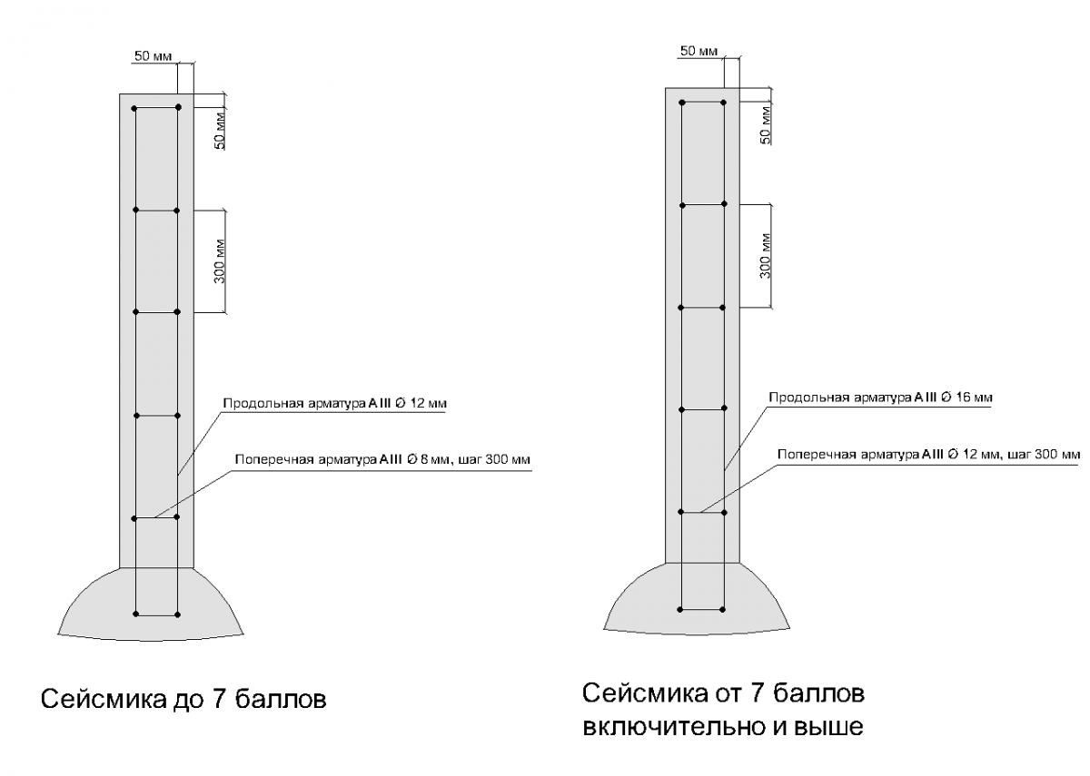 При армировании опорных столбов обустраивается продольно-поперечный армокаркас, состоящий из 4-ех продольных прутьев диаметром 12-15 мм. и соединяющих их поперечных перемычек, расположенных на расстоянии 30 см. друг от друга. В качестве соединяющих перемычек используется гладка арматура диаметром 6-8 мм.