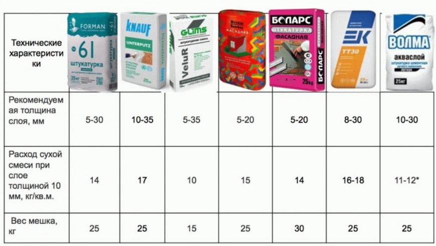 В таблице приведены примеры расхода разных видов штукатурки на 1 м².