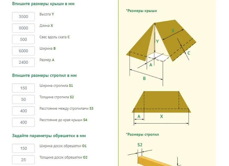 Для того чтобы рассчитать количество необходимого дерева, нужно ввести всего два параметра – площадь кровли и габариты используемого пиломатериала.