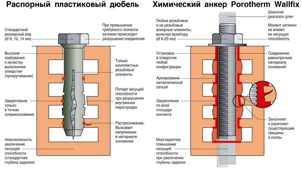 Вклеивающийся дюбель очень удобен, если необходимо зафиксировать металлический крепёж в рыхлом или ячеистом основании – например, в пустотелом кирпиче или пенобетоне. Химические анкера для пустотелого кирпича проникают в ячейки и поры, а после полимеризации прочно фиксируют болт в основании.