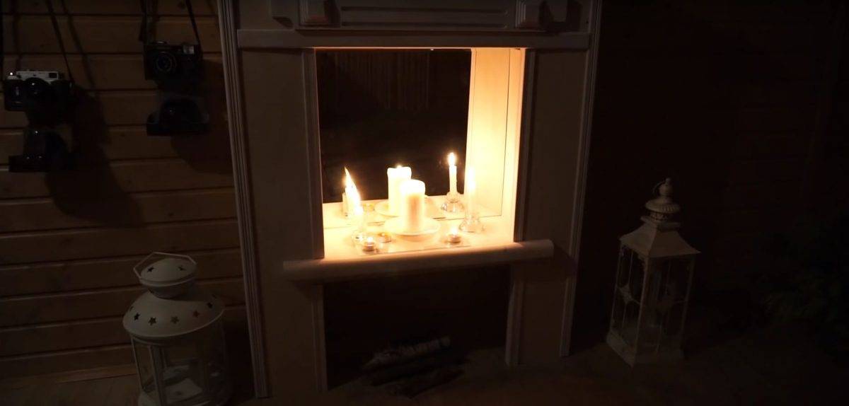 Внутри такой конструкции, для завершения картины, создайте имитацию очага. Хороший вариант – установка вместо задней стенки зеркала. При использовании свечей в топке камина, зеркало будет давать необычный визуальный эффект – создавать глубину имитационного огня.