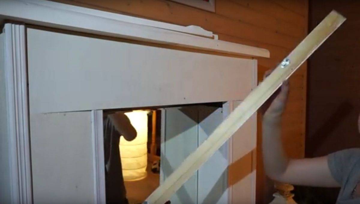 У старого шкафа или серванта снимаем дверцы. С помощью шуруповерта и саморезов обшиваем фасад шкафа фанерой или гипсокартоном так, чтобы получилась имитация топки и дровницы. Если поверхность серванта или шкафа полированная, то обрабатываем ее шлифовальной машинкой для придания шероховатости. Далее приступаем к грунтовке стен, которые после высыхания шпаклюем и выравниваем. Поверхность окрашиваем акриловой краской и клеим декоративные элементы. Углы можно отделать искусственным камнем или кирпичом.