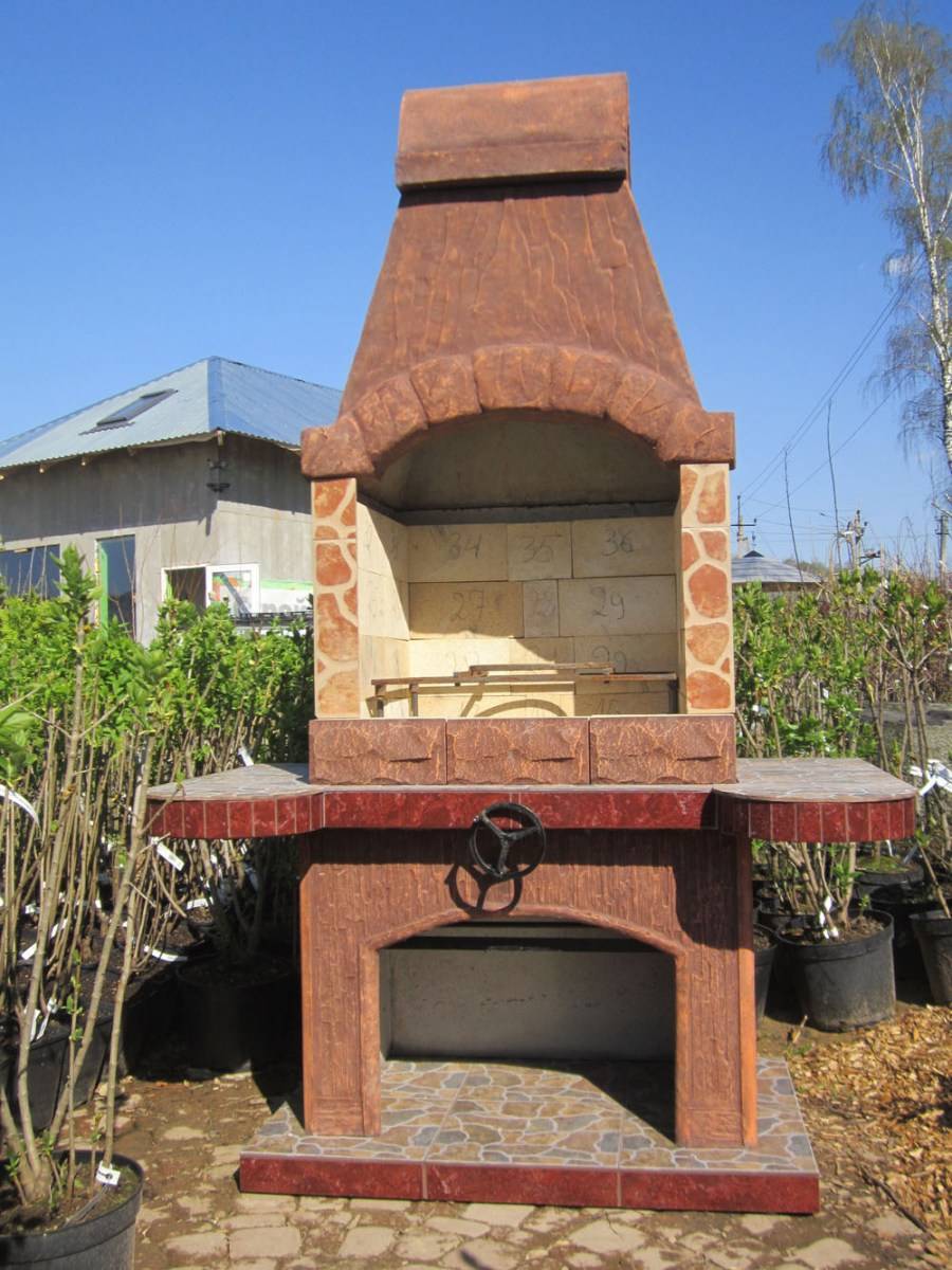 Центр конструкции – мангал из шамотного кирпича с металлическим коробом, решеткой и дымоходом. Под жаровней располагают поленницу. С боков от мангала оборудуют дополнительные отделы – русскую печь, тандыр, мойку, столешницу и другие функциональные пристройки.