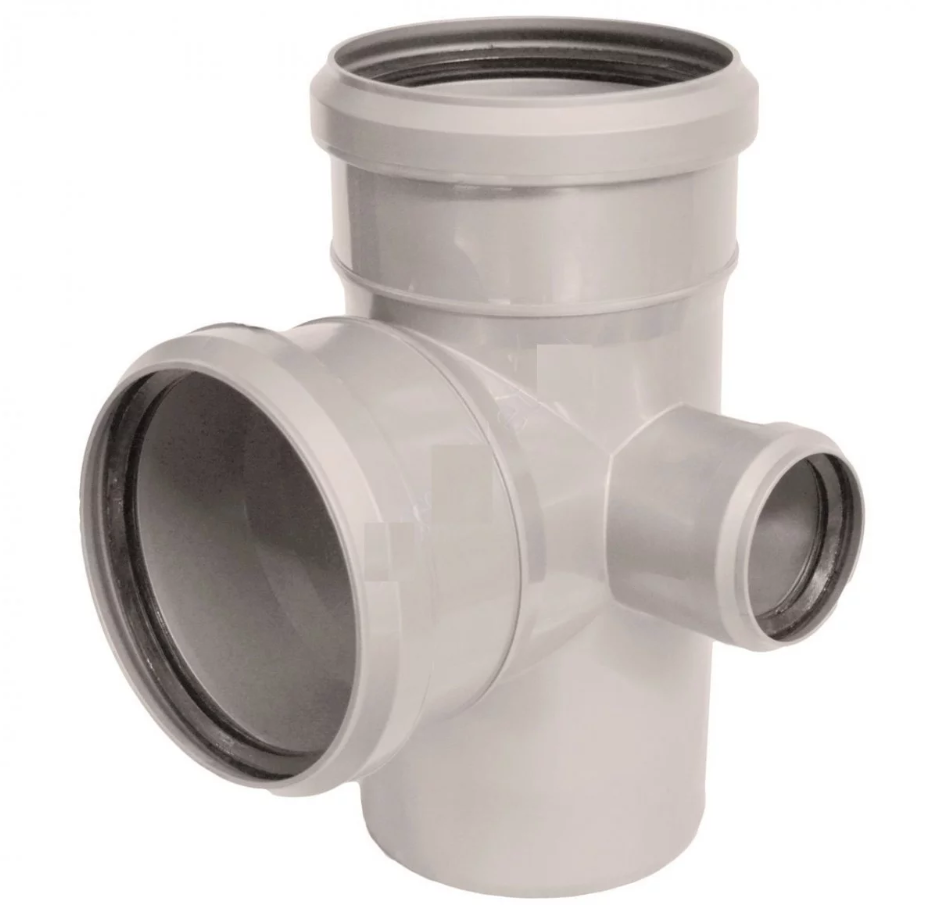 Пластиковые фитинги выпускают диаметрами от 32 мм до 315 мм, из НПВХ — 50 мм и 110 мм, из чугуна — 50 мм, 100 мм, 150 мм. Самое распространенное сочетание размеров переходных соединителей — 110х110х50 мм.