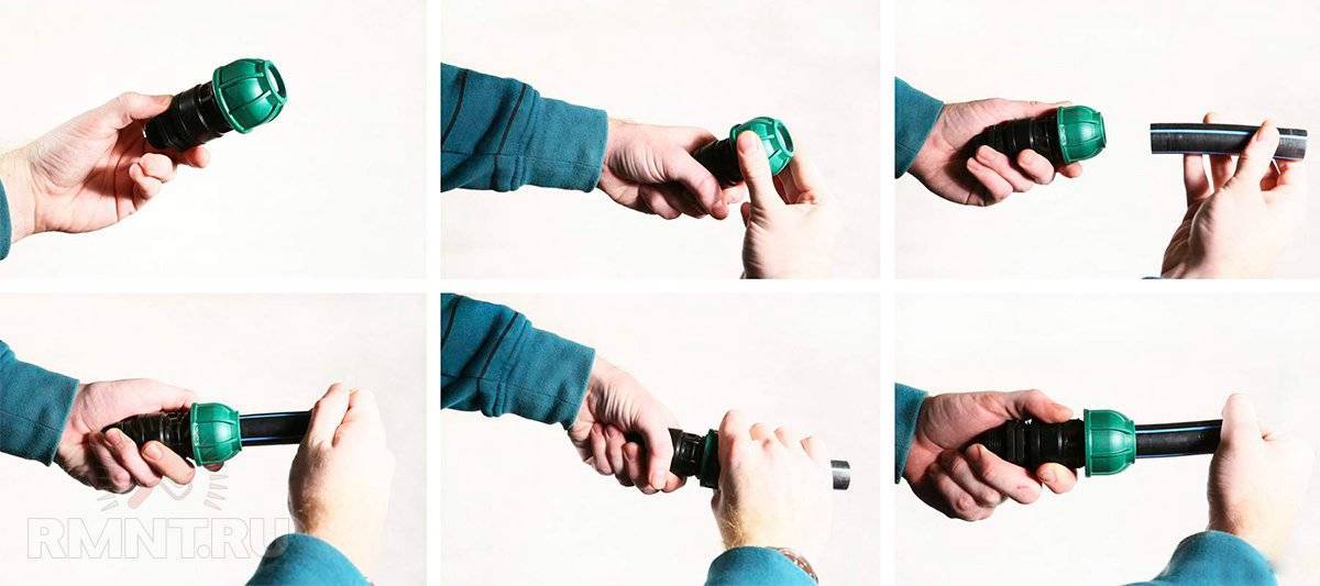 Переходник или любую другую муфту нужно накручивать аккуратно, без особых усилий. Наружная резьба изделия должна быть предварительно загерметизирована. В работе сначала надевайте накидную гайку на магистраль, а только после этого разрезанное кольцо. При необходимости с внутренней стороны трубы можно удалить фаску.