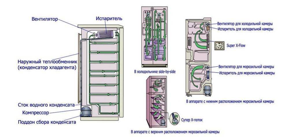Воздушный поток подается с одной из сторон, а выходит с противоположной. Если компрессор отключается, вода стекает в резервуар и далее испаряется. Существует несколько разновидностей разморозки. Рассмотрим самые популярные из них.
