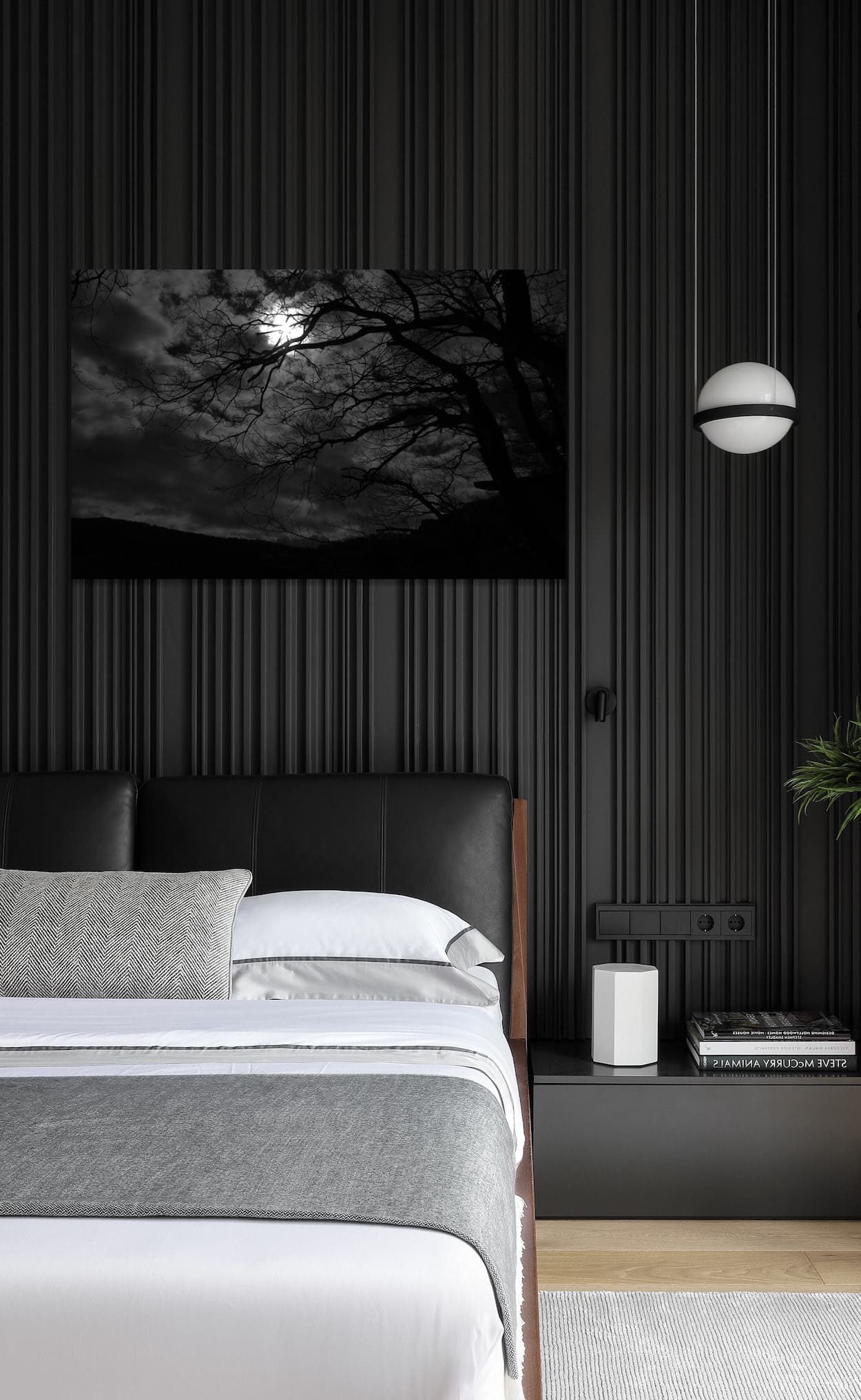 На фото в интерьере спальни флуоресцентные фотообои расположены на стене и потолке.