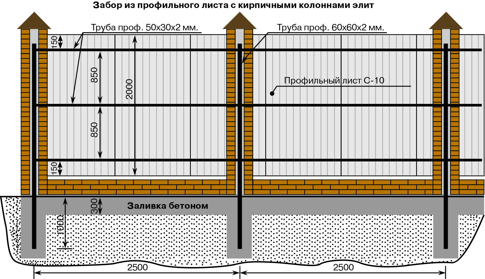 Если выбрать оптимальный шаг 2,5 м, то на возведение ограждения потребуется 6 опор, выступающих над уровнем земли на 1,5 м. По расчёту полная длина стойки вместе с подземной частью равна 1,5 / 2 х 3 = 2,25 м, с запасом — 2,5 м. Итого потребуется 2,5 х 6 = 15 м трубы или швеллера.