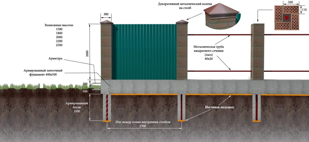 Важно помнить, что чем выше забор, тем больше будет вес кладки на фундамент. Для несущей способности опор нет жестких требований к выбору вида кирпича