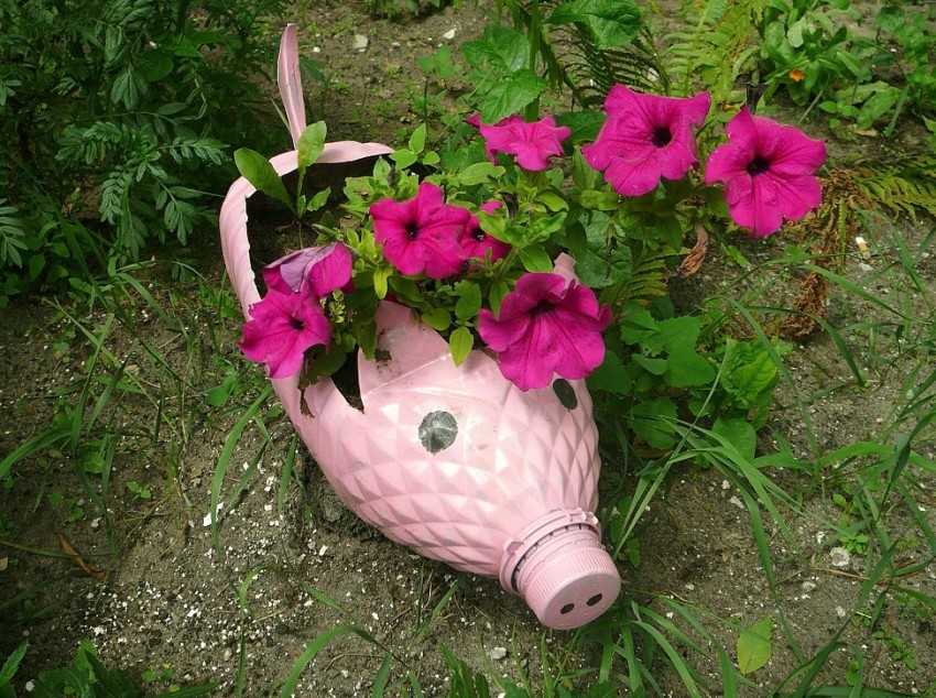 Уложив на бок крупный горшок с грунтовой смесью внутри, создают цветочный ручей, высаживая растения, начиная непосредственно от горлышка. Особенно эффектно выглядит извилистая линия.