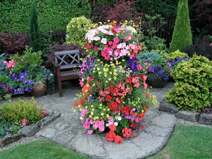 Вертикальные цветники практически не имеют ограничений по форме, например, это может быть башня, сложенная из керамических горшков.