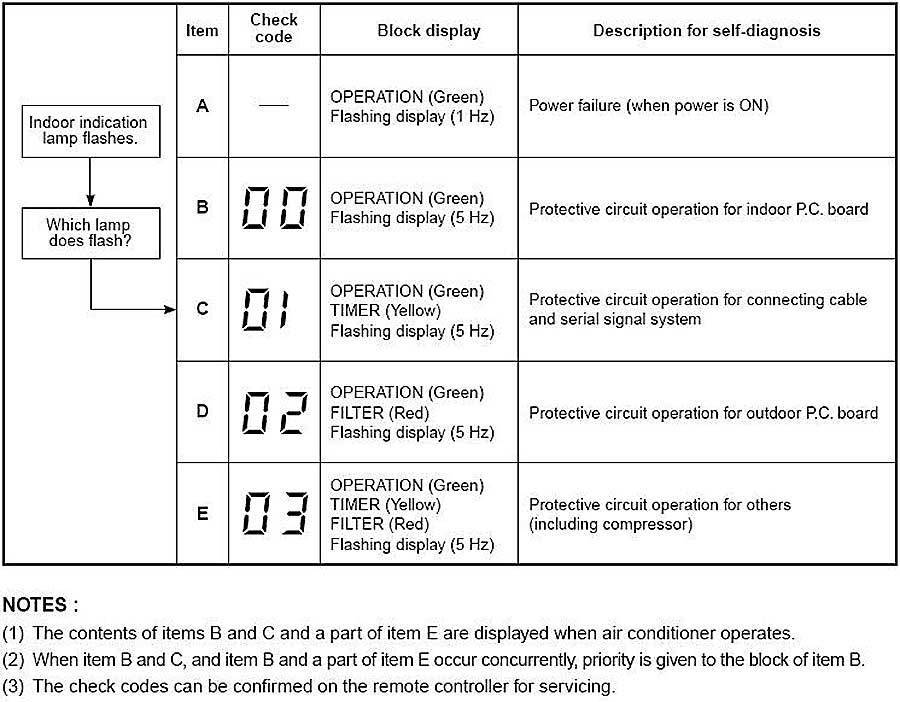 2 – возникли неисправности температурного датчика в помещении;3 – возникли неисправности температурного датчика во внутреннемтеплообменнике;6 – возникли неисправности в работе реверсивного клапана в наружном блоке;8 – возникли неисправности в двигателе вентилятора, расположенном вовнутреннем блоке;9 – нет электрического питания внутреннего блока;11 – возникли неисправности в дренажной помпе;12 – произошел сбой программного обеспечения во внутреннем блоке;13 – произошла ошибка в конфигурации;14 – потерян сигнал в центральной системе управления;15 – возникли неисправности температурного датчика во внутреннемтеплообменнике;18 – возникли неисправности в управлении наружным блоком;20 – не распознается положение блока;21 – возникли неисправности датчика тока, расположенного в наружном блоке;22 – возникли неисправности температурного датчика в наружномтеплообменнике;23 – возникли неисправности температурного датчика нагнетания;24 – возникли неисправности в работе вентилятора в наружном блоке;26 – другие неисправности в наружном блоке;27 – произошла блокировка компрессора, расположенного в наружном блоке;28 – величина температуры нагнетания недопустима;29 – возникли неисправности в компрессоре, расположено в наружном блоке;31 – произошло повышение давления в контуре наружного блока.