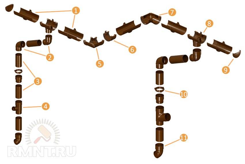 С точки зрения конструкции, любые водосточные трубы, независимо от того, из какого материала они сделаны, состоят из: