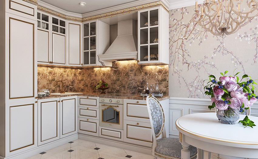 - если требуется визуальное разделение большой кухни, то допускается применение обоев в разных стилях соответственно зоне. Например, на кухне применяют обои в стиле кантри, а в столовой — покрытие с классическими витыми узорами;