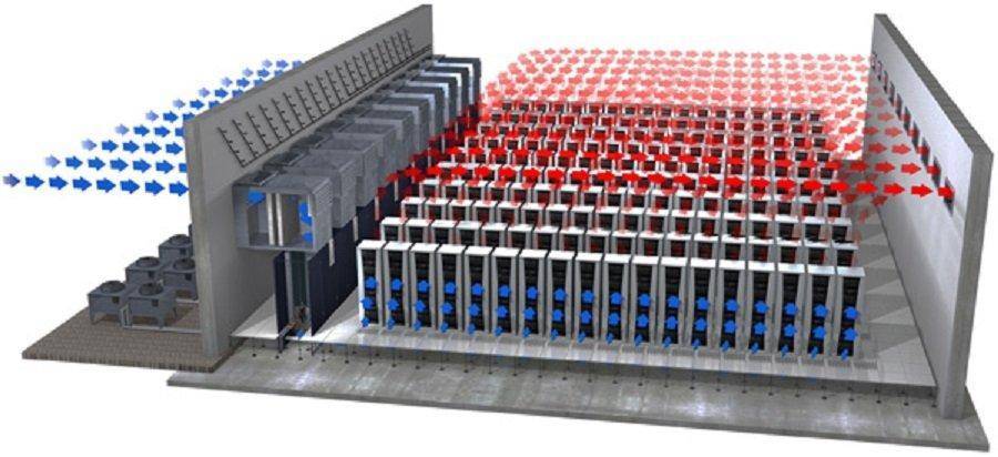 При использовании систем с притоком воздуха (Free Cooling), оборудуется вытяжная вентиляция. Такой способ охлаждения позволяет снизить энергозатраты, если температура на улице меньше той, которую выдает нагретое оборудование. На иллюстрации показан пример со шкафными кондиционерами с внешними блоками.