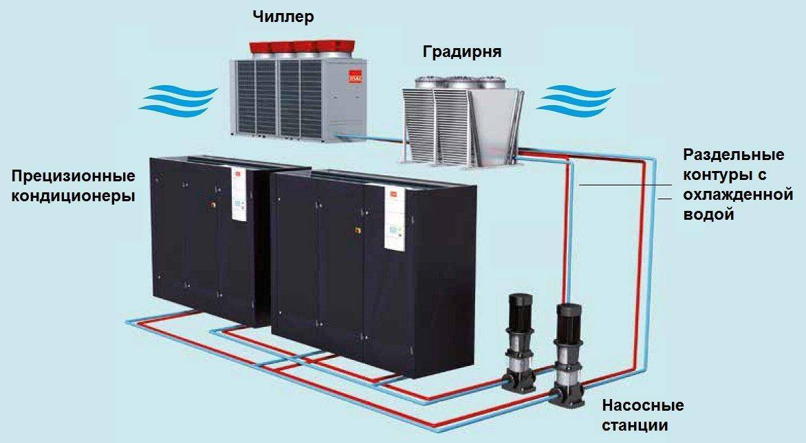 Схема подключения прецизионных кондиционеров к чиллеру и градирне.