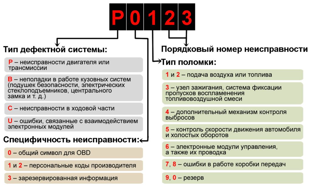 - Р — неполадки в работе силового агрегата, трансмиссии, электроники и датчиков;
