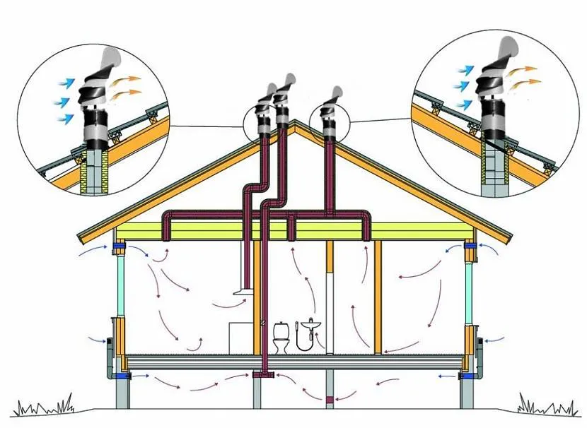 Задача труб — обеспечить циркуляцию воздуха, которая осуществляется из-за разницы давлений снаружи и внутри строения, либо вентилятором.