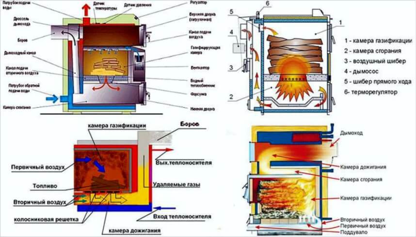 В качестве энергоносителей, как правило, применяется древесина. Под воздействием высочайших температур и дефицита воздуха они расщепляются до газообразных летучих веществ, которые сгорают в пиролизной камере, с выработкой тепловой энергии, которая через теплообменник передается греющему теплоносителю отопительного контура.