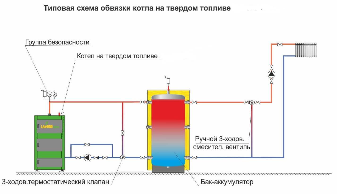 Типовая схема подключения котлов для отопления на дровах содержит два базовых узла, разрешающих ей надежно действовать в системах обогрева индивидуального дома. Это группа безопасности и водяная группа с трехходовым клапаном с термоголовкой и датчиком температуры.