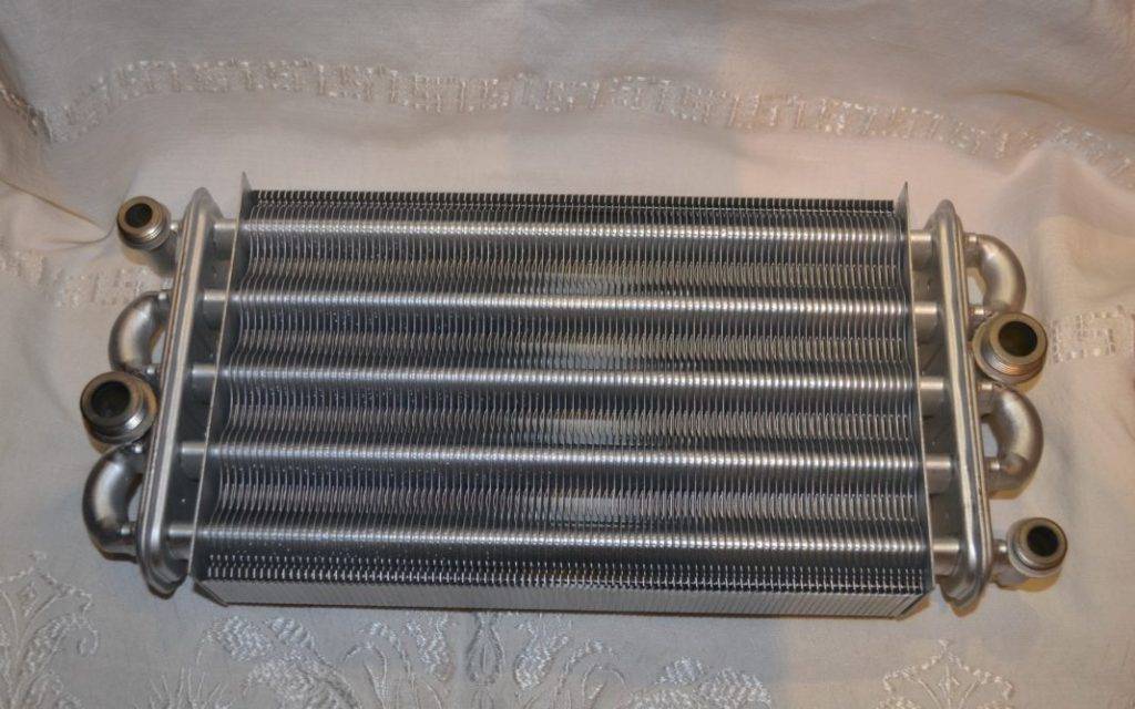 Скопление накипи в теплообменнике. Можно заметить, что техника долго нагревает жидкость, батареи слабо греются. Очистите трубки радиатора от отложений. Для этого узел лучше снять, но это можно сделать не во всех моделях. Поэтому снимите кожух, отключите прибор от газа и воды. Подключите к теплообменнику трубки от насоса, прогоните по системе очистную жидкость. Специальные средства можно подобрать в магазине. Затем промойте детали проточной водой.