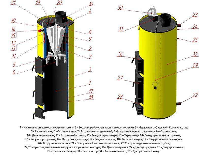 Компоновка дровяных котлов длительного горения предполагает расположение основной топочной камеры непосредственно над зоной сжигания вторичных газов, а сообщение между ними осуществляется через специальные керамические форсунки, способные работать при температуре от 800 до 1000 С. Днище главного топливного отсека оборудовано специальной термостойкой постелью, чаще всего из шамотного кирпича или керамобетонных блоков.