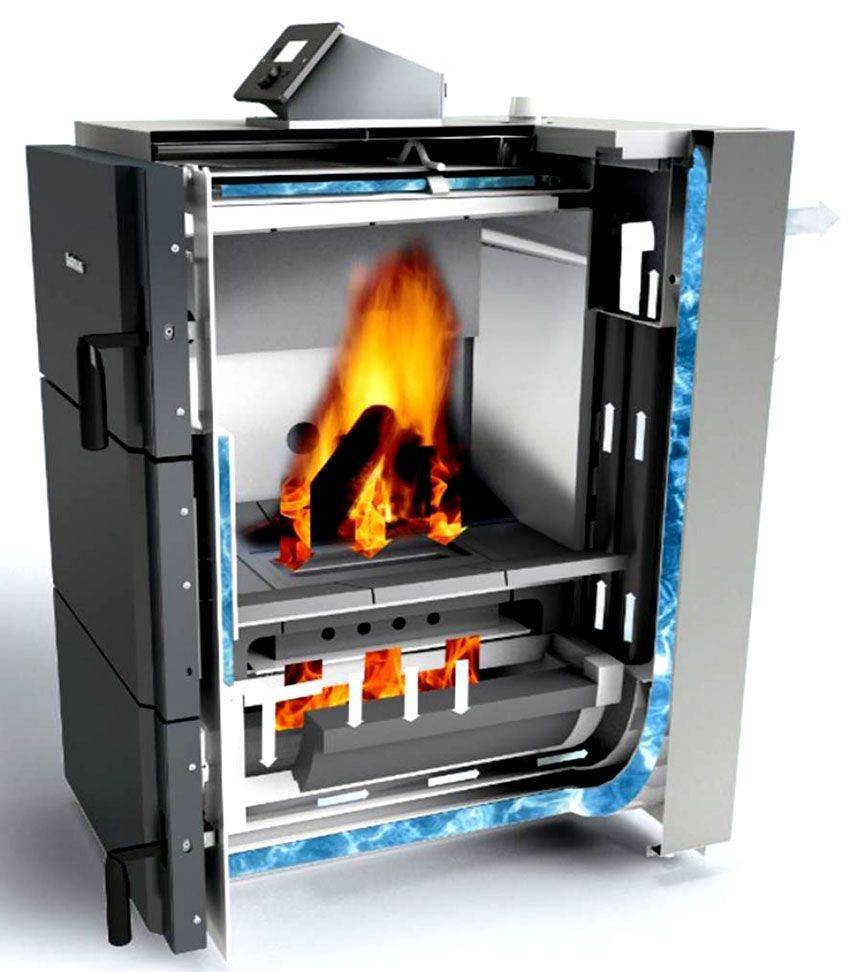 Циркулирующий в водяной рубашке теплоноситель быстро нагревается за счет контакта с горячими стенками камеры сгорания. Высокую производительность таких конструкций обеспечивает большая площадь теплообменника.