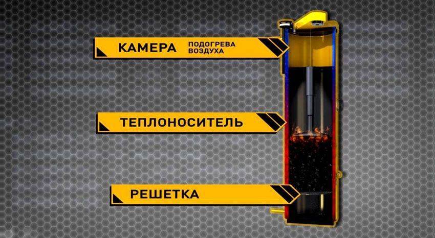 Образовавшиеся в результате пиролиза газы поступают в верхнюю часть корпуса, где смешиваются с предварительно разогретым вторичным воздухом и воспламеняются. Раскаленная боковая поверхность непосредственно контактирует с теплоносителем, поступающим в контур отопления через выходной патрубок. Для большей эффективности, прибор может быть установлен в защитный кожух, а образовавшаяся полость заполнена пенополиуретаном или другим негорючим теплоизолятором.