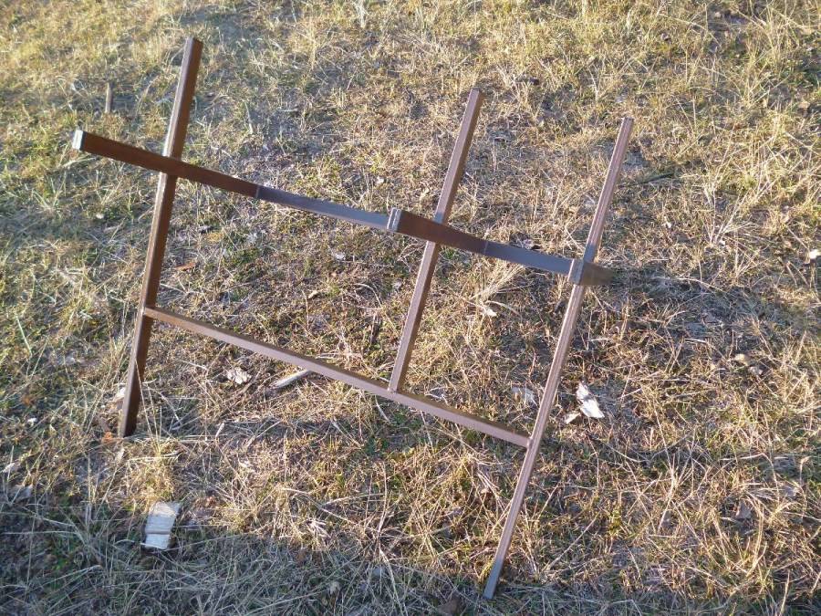 Куски трубы крепятся между собой под углом 45°. Получившиеся три крестовины для жесткости обвязываются такой же трубой горизонтально и по диагонали.