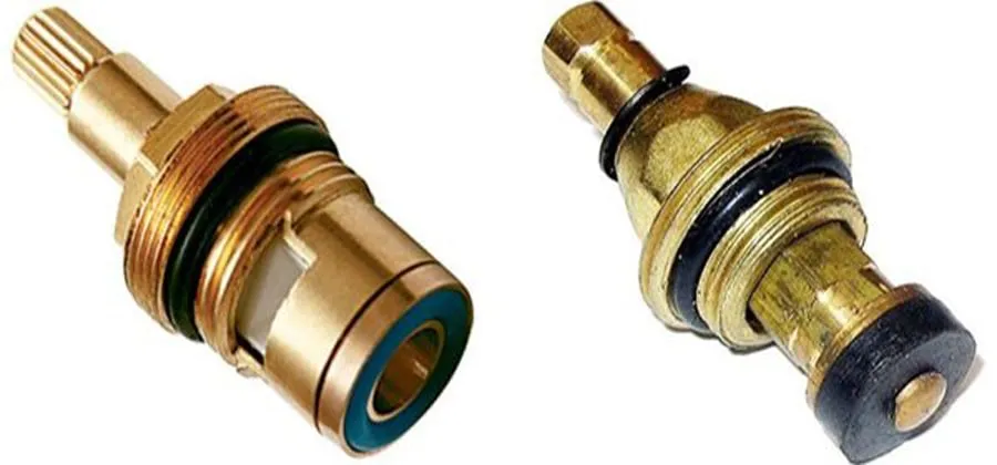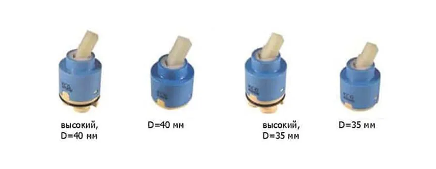 Картридж, это запорная арматура для смесителя в виде пластикового цилиндра, где внутри имеются три отверстия в нижней части и керамические пластины, регулирующие интенсивность потока холодной и горячей воды. В верхней части устройства находится шток, на который надевается ручка, поэтому такие модификации называют однорычажными. То есть, если перед вами запорная арматура с одним рычагом, то это говорит о том, что система управляется картриджем, который может быть разных размеров в диаметре.