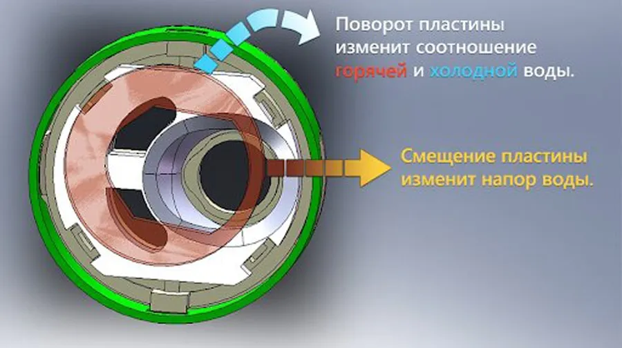 Теперь посмотрите на верхнее изображение (вид снизу) – там схематично показано, как осуществляется регулировка горячего и холодного потока при помощи картриджа смесителя для бани. Дугообразные отверстия, которые вы видите слева, изменяют свой размер при повороте пластины рычагом, надетым на шток, или же одно из них перекрывается полностью – так изменяется соотношение горячей и холодной воды. К третьему, круглому отверстию подключается излив (гусачок, из которого течет вода) – туда попадает уже отрегулированный поток.