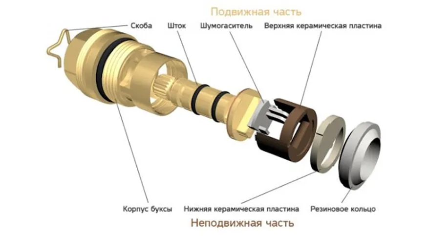 Краны для бани смесительного типа могут быть с двумя вентилями, где переключателями служат барашки или небольшие рычажные ручки. Такая запорная арматура распознается с первого взгляда – если в современном смесителе два барашка или два рычага, значит, под каждым из них (в корпусе крана) находится керамическая кран-букса. Этот запорный механизм, по сути, регулируется верхней подвижной и нижней неподвижной пластиной (см. изображение вверху). В этих керамических деталях предусмотрены симметричные отверстия, которые в открытом положении точно совпадают друг с другом. При повороте ручки пластины смещаются относительно друг друга, и отверстие перекрывается либо частично, либо полностью.