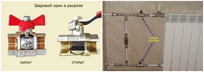 - При централизованном однотрубном отоплении ставят два шаровых крана: один — на входную линию, второй — на выходную. Такая конструкция даёт возможность оставить теплоноситель в отдельной батарее при сливе воды из системы или при демонтаже радиатора для чистки и периодической профилактики.