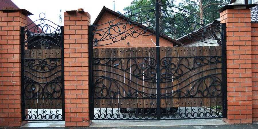 Кованый вариант украшения забора станет не только оригинальным завершением строительства на участке, но и прекрасной защитой для дома. Распашные калитки с элементами ковки особенно популярны в комбинации с металлическими каркасами заборов.