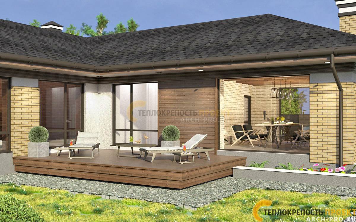 Такая баня не только смотрится красиво, а она еще и очень функциональна, поскольку в ней удобно размещаются такие помещения, как парилка, тамбур, а также уютная просторная терраса с собственной кровлей. Это отличный вариант, предназначенный для среднестатистической семьи и для участка со средней площадью.