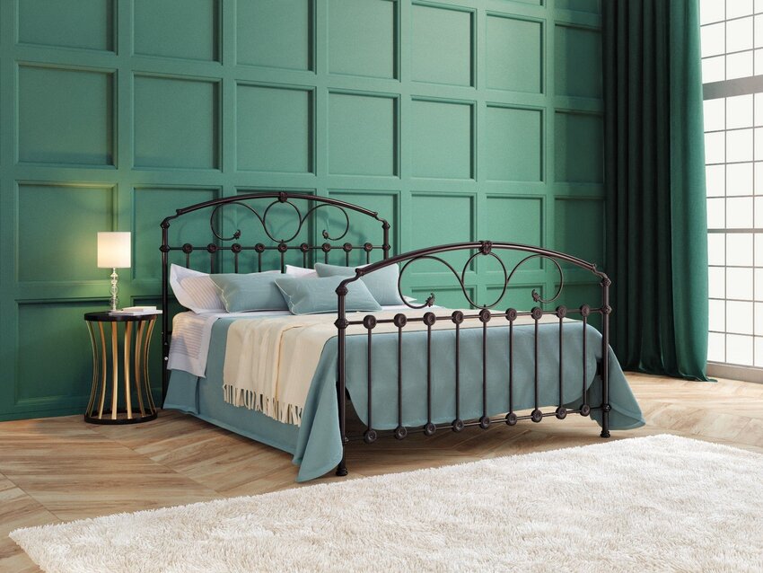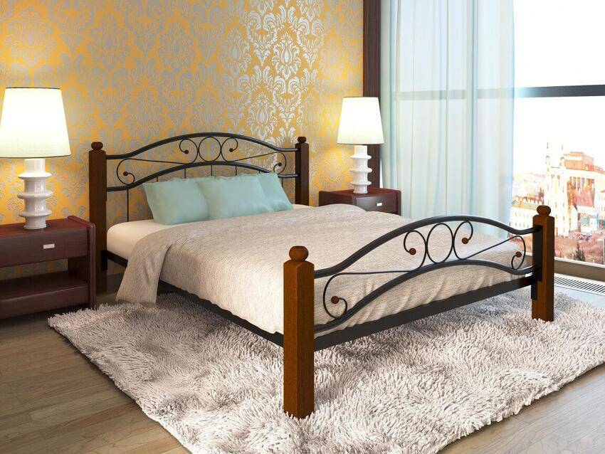Кровать классического дизайна металлического или деревянного материала (дуб, сосна, ясень, красное дерево).