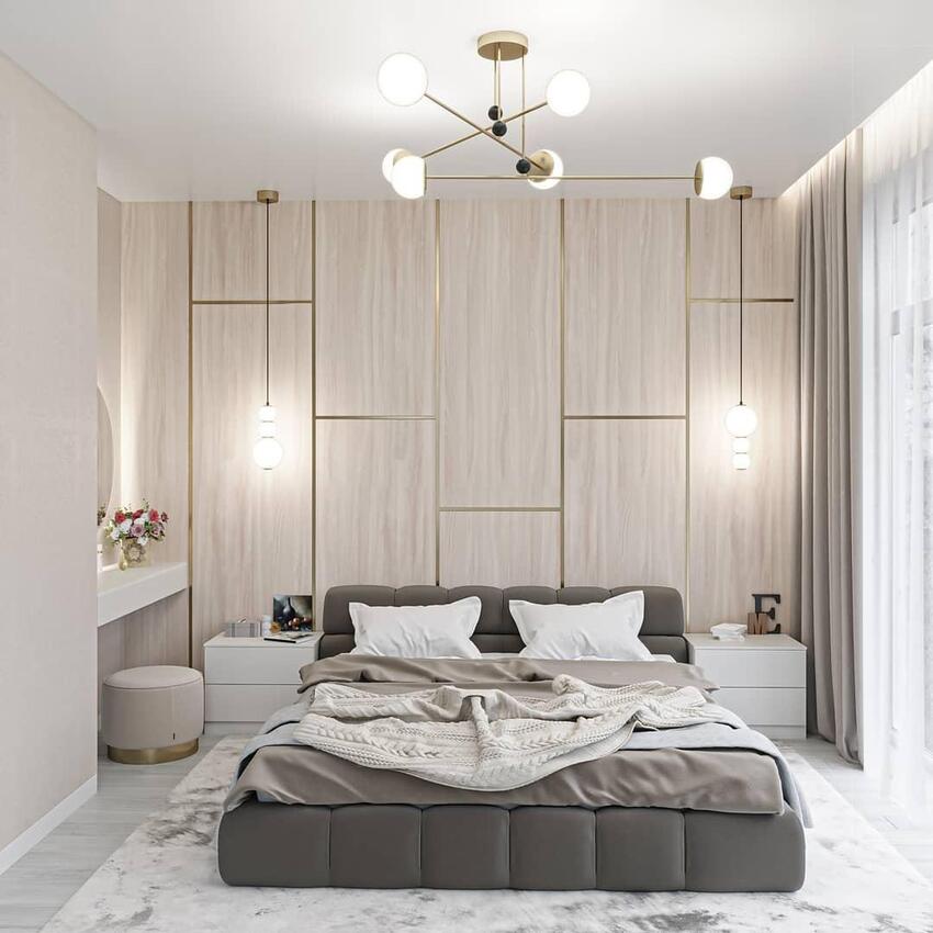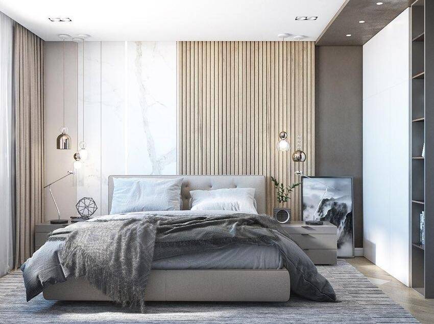 Отдавайте предпочтение однотонной отделке и мебели: спокойная нейтральная палитра цветов – идеальное решение для спальни в современном стиле.