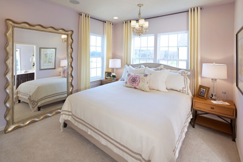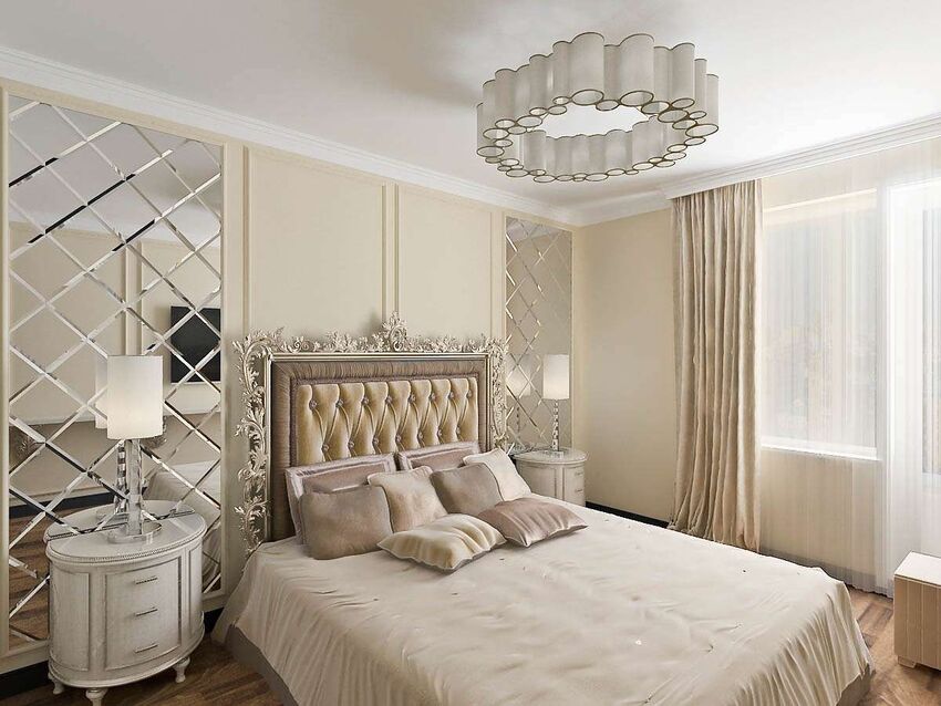 Используйте принципы зонирования пространства — формируйте планировку открыто, расширяя пространство спальни. Глянцевые поверхности и зеркала – прекрасный способ этого достичь.