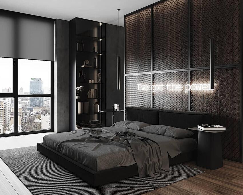В современной спальне, оформленной в черной цветовой гамме, легко создать ощущение уюта и камерности. Чтобы помещение не казалось мрачным, стоит заранее продумать вариант размещения темных цветовых акцентов. При наличии большой площади допустимо окрасить одну из стен черной краской. Если же комната маленькая – достаточно выбрать кровать черного цвета, которая станет главным элементом интерьера.