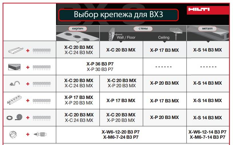 И в конце приведем обобщенную таблицу для облегчения выбора крепежа при использовании монтажного пистолета Hilti BX3: