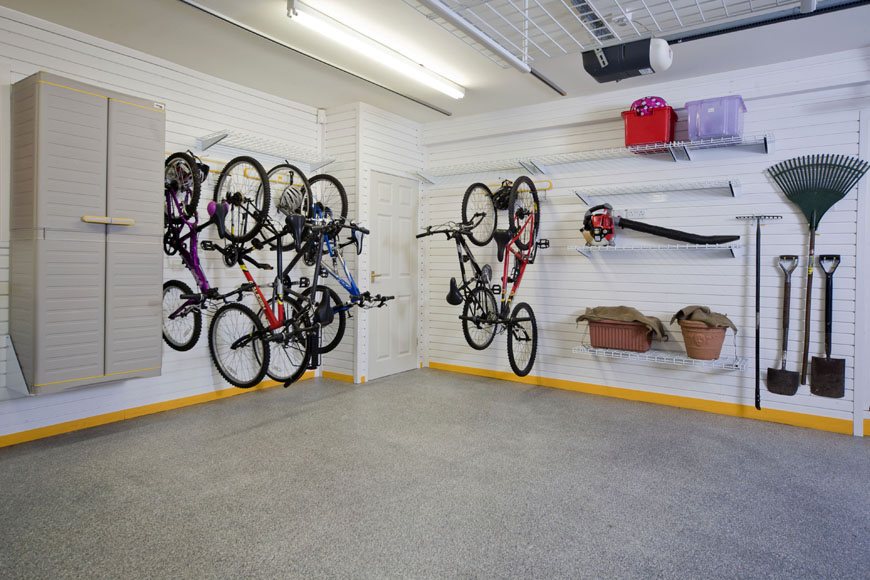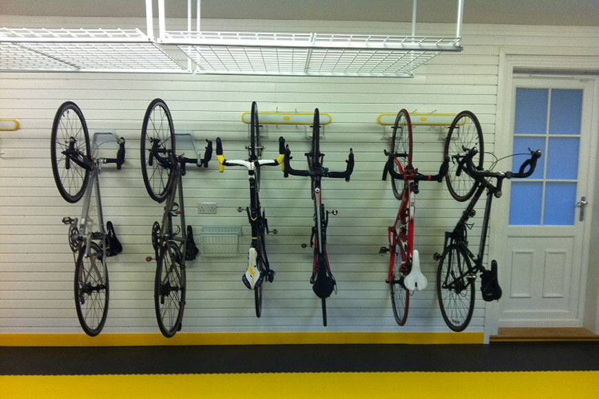 Если велосипед не стоит на полу, а висит на стене или под потолком, то под ним образуется свободное пространство, которое тоже можно эффективно использовать, предусмотрев хранение, например, колес автомобиля или любых других вещей…