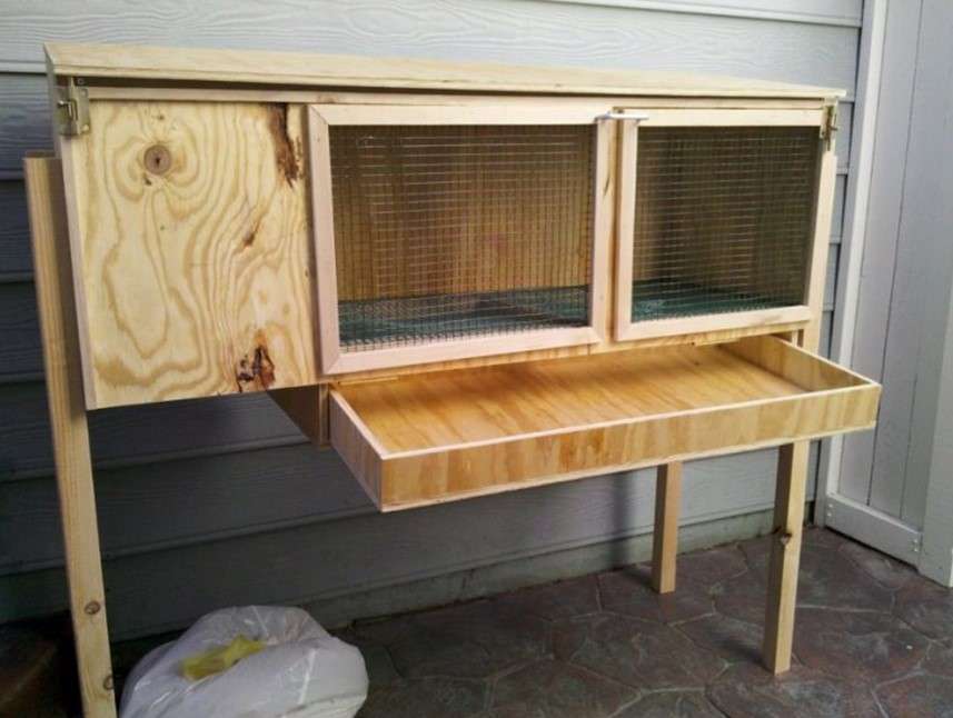 Пол будет состоять из двух частей – одна из решетки или железной сетки, а другая из сплошных досок. Зачем это нужно? Кролики постоянно едят и опорожняют кишечник. При таком раскладе нужно было бы чистить клетки каждый день, а это не очень веселое занятие. Поэтому клетки для кроликов делают из двух частей. Место, где сплошные доски — это центр отдыха кролей. Там они отдыхают, спят и проводят свое время. Эти животные по своей природе очень чистоплотные, поэтому они держат это место в чистоте и порядке. Весь мусор и помет остается в том месте с решеткой, где он и проваливается сквозь нее и попадает в специальный ящик. Этот удивительный факт позволяет содержать клетки в постоянной чистоте и сухости. И кролям хорошо, и хозяин доволен.