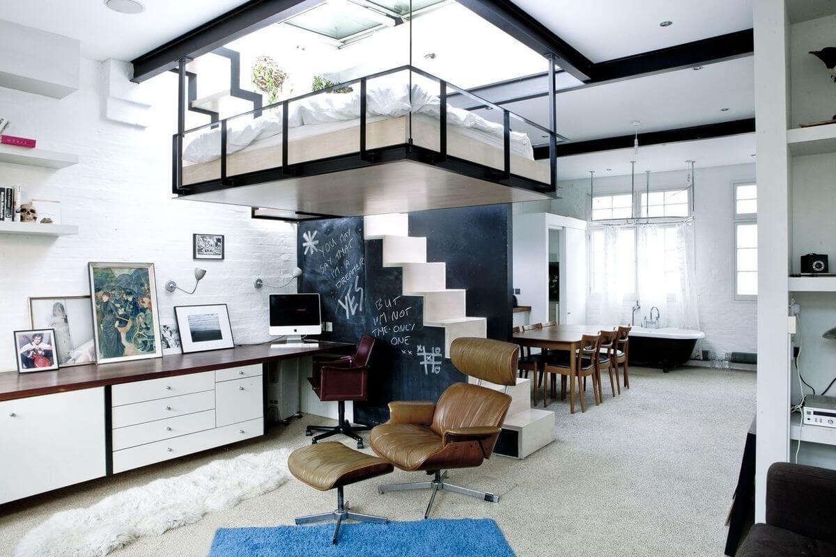 К такому приему прибегают в двух случаях. В первом случае необходимо рационально использовать жилую площадь небольших размеров, а во втором требуется выделить спальную зону в интерьере открытой планировки (причем сделать это можно весьма оригинальным способом). Вот и получается, что кровать под потолком чаще всего размещают либо в однокомнатной квартире, либо в квартире-студии.