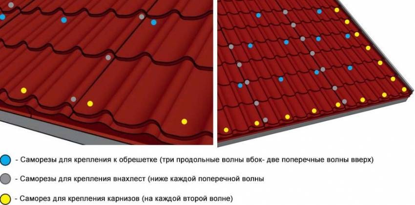 Обратите внимание! При фиксации металлочерепицы важно не перекрутить саморез, чтобы избежать деформации материала и сколов на полимерном покрытии. Для этого лучше работать шуруповертом на низких оборотах