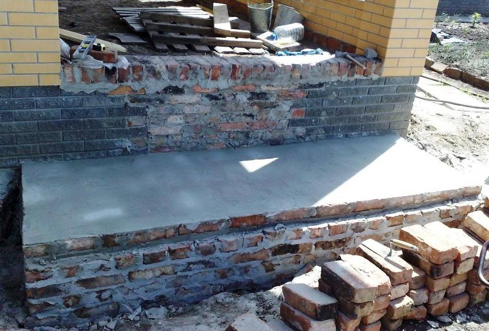 Выложив первую ступень, оставшееся до цоколя дома пространство заливают цементным раствором или засыпают камнем. После застывания бетонной подушки, выкладывают вторую ступень. Получившееся «корыто», огражденное ей, стенками парапета и цоколем здания опять заливают бетонным раствором. Затем выкладывают третью ступень и так до верхней площадки. Последнюю выкладывают двумя рядами кирпичей сплошняком.