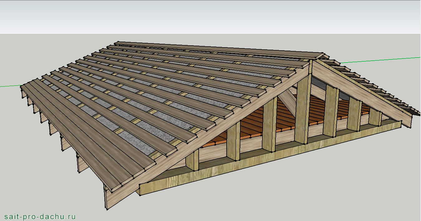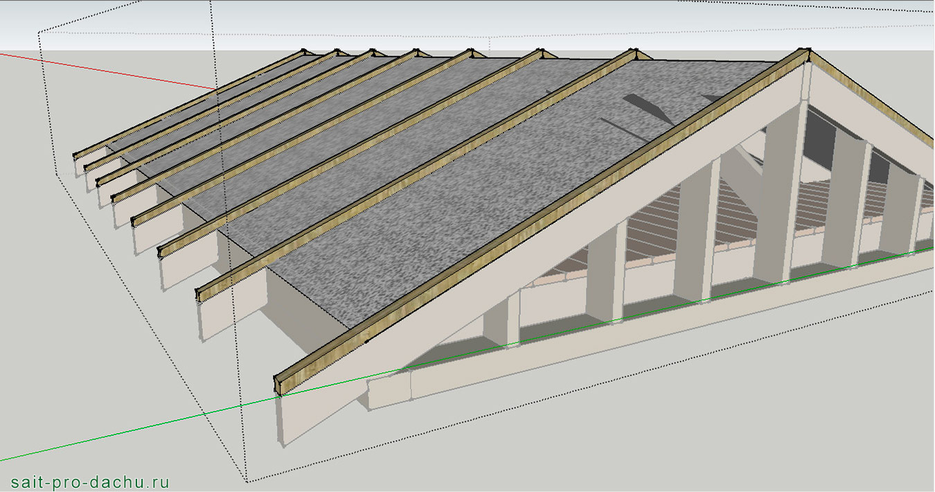 Из рисунка несложно понять, что согласно проекту на спусках необходимо бить доски сплошным щитом, тогда как на остальной части ската, достаточно и через одну. Подобная обрешётка подходит не только для жёсткого профнастила, но и для металлочерепицы.