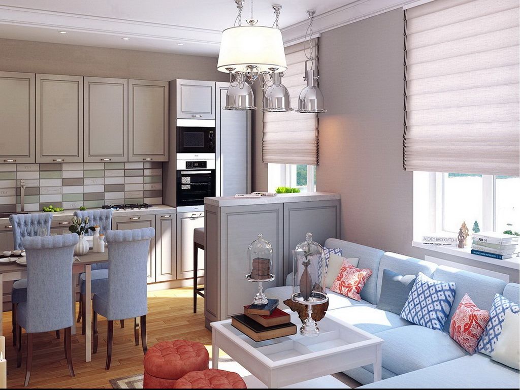 В качестве приемов визуального и реального деления пространства могут выступать комбинированные обои или покраска стен в разные цвета, нестандартное расположение дивана (спинкой к кухонной зоне, например), легкие конструкции перегородок, островная планировка кухонного гарнитура и др.